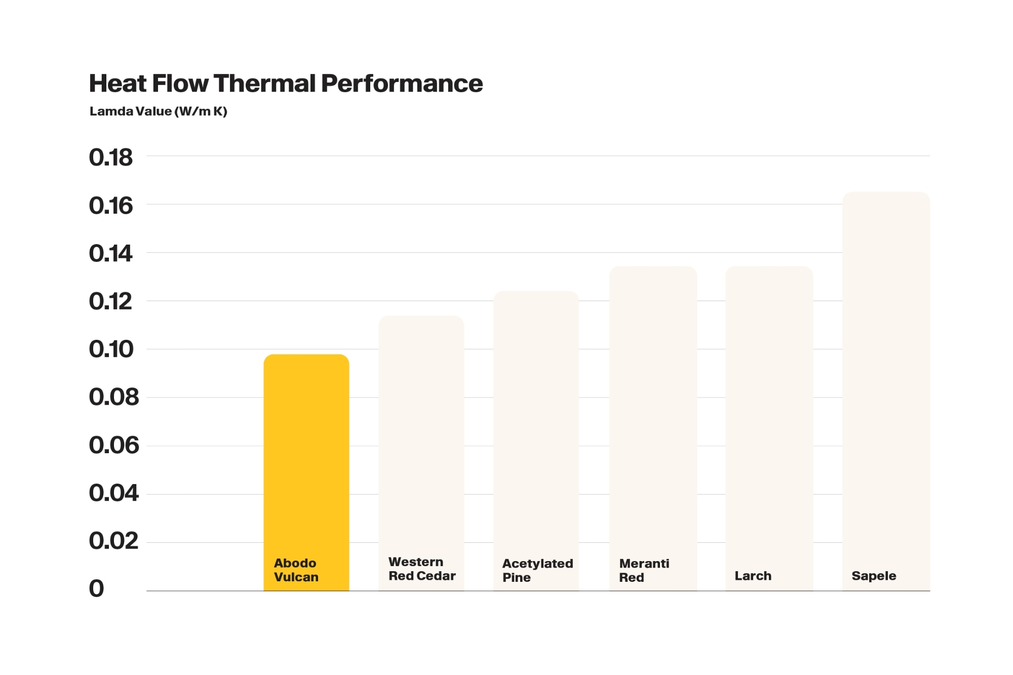 Abodo has created Vulcan with extremely low thermal conductivity, even when compared with other timber products. We put our 42mm Vulcan blocks to the test with a Heat Flow Meter, and the results spoke for themselves - better thermal performance than many commonly used window timbers. That means more flexibility for designers, improved U-values, and a cleaner, more refined look, all while keeping things energy efficient and production friendly.